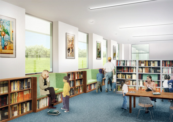 The trustees hired CDR Studio for architectural services outlined in the master plan, and through the course of work, CDR Studio gained valuable exposure to the most current developments in library design. The interior reorganization incorporates emerging technologies from WiFi access to self-checkout stations. It also exhibits new ideas of spatial organization and programmatic adjacencies while maximizing precious space to accommodate additional stacks, collections, computer workstations, quiet rooms and reading areas. A series of new window reading nooks and a new program room enhance the Children’s Library. By expanding the existing mezzanine within the double-height Main Reading Room, CDR Studio added additional stack space, a teen area and a study area overlooking a nature preserve. The computer workstations (used for Internet access and the library catalog) bridge the zone between adult, teen and children services — creating a zone of intergenerational overlap. A countertop along the mezzanine edge creates a flexible study area.  A “quick service” area with “New Releases,” popular media and self-checkout units is featured just inside the library’s entrance; the redesigned entry lobby includes a large public art gallery with a bench for waiting patrons.