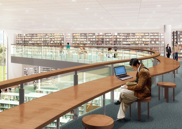 The lighting in the public spaces emphasizes the primary functions of circulation and reference; it also creates a sense of rhythm and differentiates user areas. CDR Studio's project team included Suzan Tillotson, who executed state-of-the-art lighting design at the Seattle Main Library. The material palette was also a critical component in the creation of an inviting, functional and durable library. Translucent and transparent glass walls now being used throughout the library extend the feeling of public space, as well as help maximize light and air. In addition, the new material palette — including maple cabinetry and furniture, cork-based flooring, recycled carpets and a custom acoustical ceiling panel system — transforms the existing concrete-block interior, creating a sense of warmth.