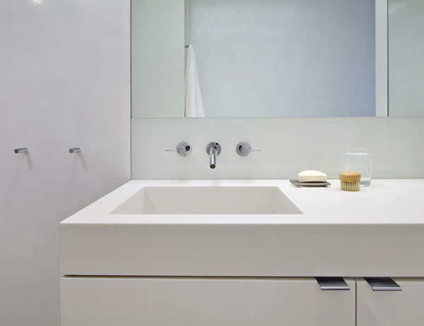 To respond to these requirements, all existing interior walls were stripped away during demolition, leaving an open and airy 2,500 square foot space, divided lengthwise by four original 1920s-era steel columns. A full-height storage core was inserted between these columns. The L-shaped core serves as both a spatial divider that delineates rooms, as well as an active element within each by providing display cabinets in living spaces, integrated appliances and work surfaces in the kitchen, equipment storage in the office and exercise area, and concealed pocket doors for privacy as needed.